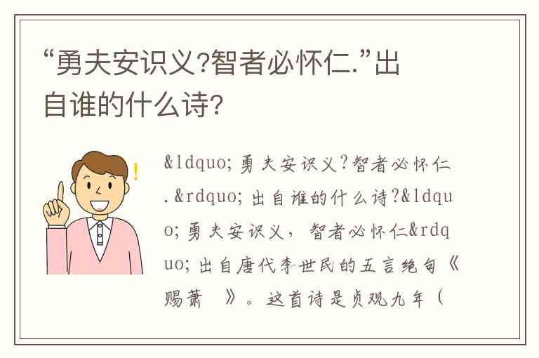 “勇夫安识义,智者必怀仁”出自唐代李世民的五言绝句《赐萧瑀》。这首诗是贞观九年(公元635年)李世民赐给大臣萧瑀的作品,全诗为:“疾风知劲草,板荡识诚臣。勇夫安识义,智者必怀仁。”