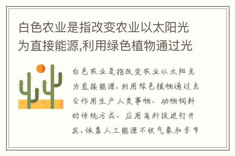 该选项中,工厂利用工农业废液、废气、废渣等蛋白质资源生产微生物肥料,完全符合白色农业的定义:以微生物为核心,通过工业生产模式(工厂环境)实现资源循环利用,产品属于白色农业六大产业之一的微生物肥料。其生产过程不依赖太阳光和绿色植物光合作用,而是依靠人工控制的生物工程技术,这与白色农业“变革传统农业生产方式”的本质一致。