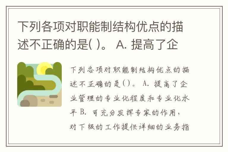 下列各项对职能制结构优点的描述不正确的是( )。 A. 提高了企业管理的专业化程度和专业化水平 B. 可充分发挥专家的作用,对下级的工作提供详细的业务指导 C. 直线领导的工作负担得到了减轻 D. 责权关系明确