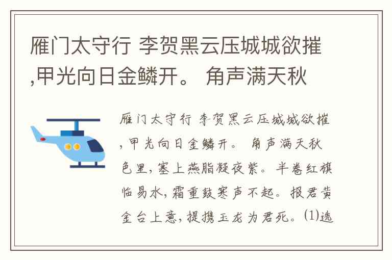 雁门太守行 李贺黑云压城城欲摧,甲光向日金鳞开。 角声满天秋色里,塞上燕脂凝夜紫。半卷红旗临易水,霜重鼓寒声不起。报君黄金台上意,提携玉龙为君死。⑴选出赏析有误的一项( ) A. 本诗记写战事,表达了将士报效朝廷的忠心。以表浓重颜色的词语写战争场景是本诗的突出特色。 B. 前两句既是写景也是记事,句中的“压”“摧”二字写出了敌军气势之盛,“开”字表现了守城将士的雄姿。 C. “角声”“秋色”从听觉和视觉角度渲染了战争的气氛,“燕脂”是指塞上的泥土在夜色下凝成的胭脂色,写出了边塞风光的壮美。 D. “易水”运用荆轲《易水歌》的典故,烘托了战争的悲壮,表现了将士们舍身报国的豪情。