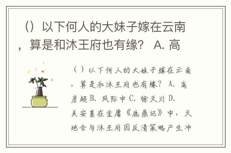 在金庸《鹿鼎记》中,天地会与沐王府因反清策略产生冲突,天地会青木堂骨干钱老本将沐王府小郡主沐剑屏藏在茯苓花雕猪中送入皇宫,本意是给沐王府制造麻烦,却意外促成她与韦小宝的姻缘。这一情节中涉及的人物关系,正与题目中"大妹子嫁在云南"的描述形成关联——正确答案是C.徐天川。
