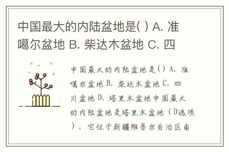 中国最大的内陆盆地是( ) A. 准噶尔盆地 B. 柴达木盆地 C. 四川盆地 D. 塔里木盆地