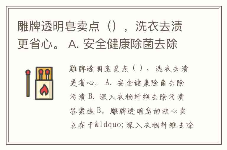 雕牌透明皂卖点(),洗衣去渍更省心。 A. 安全健康除菌去除污渍 B. 深入衣物纤维去除污渍