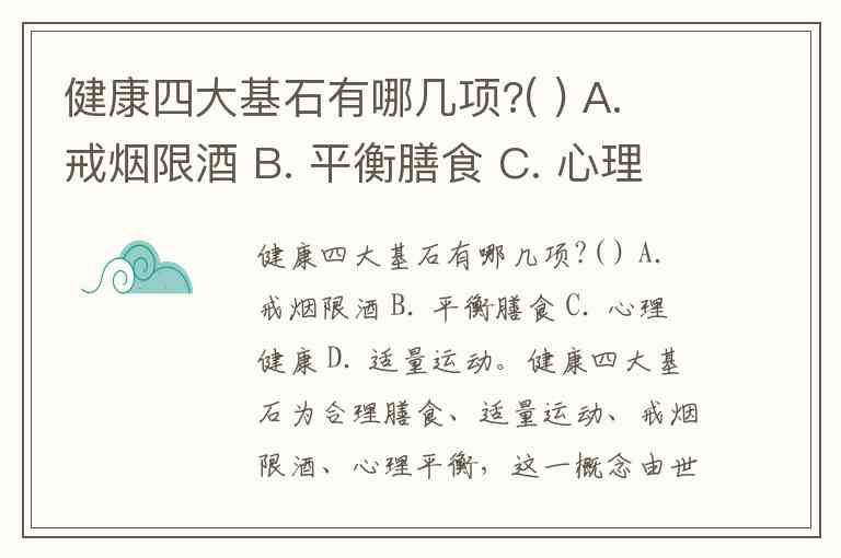 健康四大基石有哪几项?( ) A. 戒烟限酒 B. 平衡膳食 C. 心理健康 D. 适量运动。