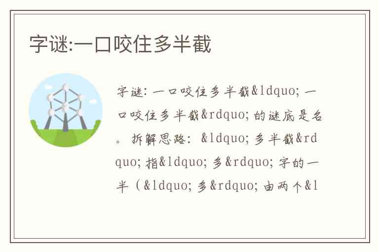 拆解思路:“多半截”指“多”字的一半(“多”由两个“夕”组成,取一半为“夕”),“一口咬住”即“口”字与“夕”组合,形成“名”字。这个字谜通过拆分字形部件并巧妙关联“咬”的动作,将“夕”与“口”自然融合,既符合汉字结构逻辑,又暗藏文字游戏的趣味。
