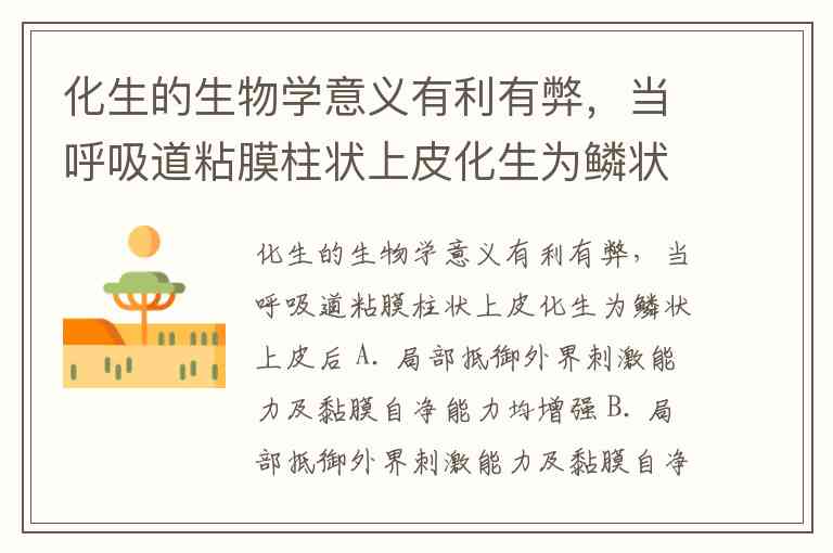 化生的生物学意义有利有弊,当呼吸道粘膜柱状上皮化生为鳞状上皮后 A. 局部抵御外界刺激能力及黏膜自净能力均增强 B. 局部抵御外界刺激能力及黏膜自净能力均减弱 C. 局部抵御外界刺激能力增强黏膜自净能力减弱 D. 局部抵御外界刺激能力减弱黏膜自净能力增强