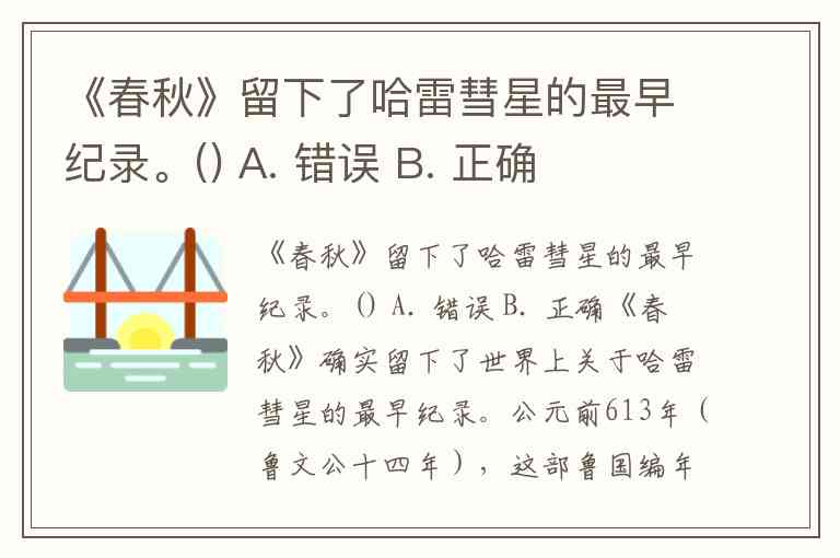 《春秋》留下了哈雷彗星的最早纪录。() A. 错误 B. 正确