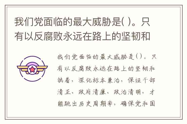 我们党面临的最大威胁是( )。只有以反腐败永远在路上的坚韧和执着,深化标本兼治,保证干部清正、政府清廉、政治清明,才能跳出历史周期率,确保党和国家长治久安。 (A) A. 腐败 B. 脱离群众 C. 能力不足 D. 作风问题