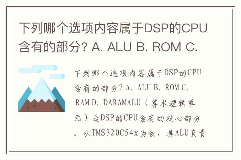 下列哪个选项内容属于DSP的CPU含有的部分? A. ALU B. ROM C. RAM D. DARAM