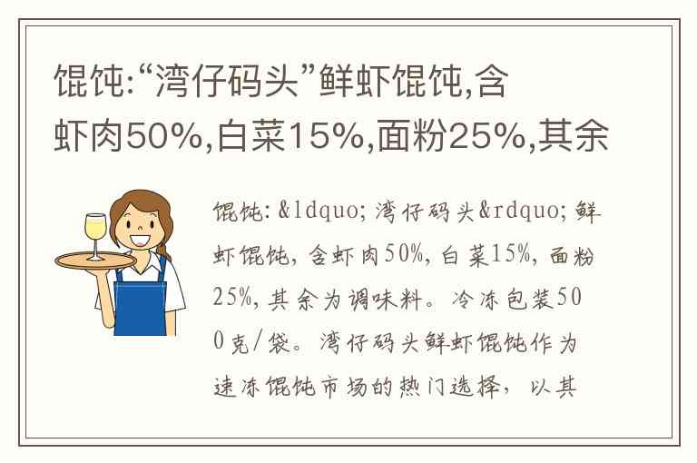 馄饨:“湾仔码头”鲜虾馄饨,含虾肉50%,白菜15%,面粉25%,其余为调味料。冷冻包装500克/袋。