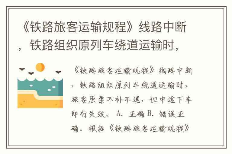 《铁路旅客运输规程》线路中断,铁路组织原列车绕道运输时,旅客原票不补不退,但中途下车即行失效。 A. 正确 B. 错误