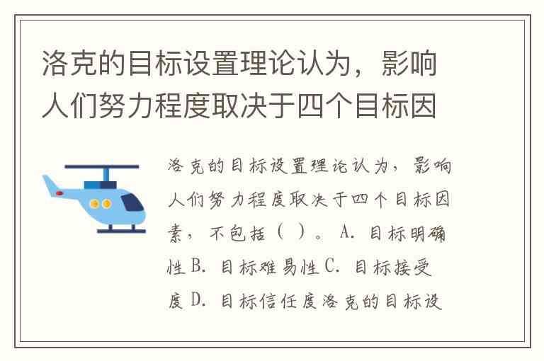 洛克的目标设置理论认为,影响人们努力程度取决于四个目标因素,不包括( )。 A. 目标明确性 B. 目标难易性 C. 目标接受度 D. 目标信任度