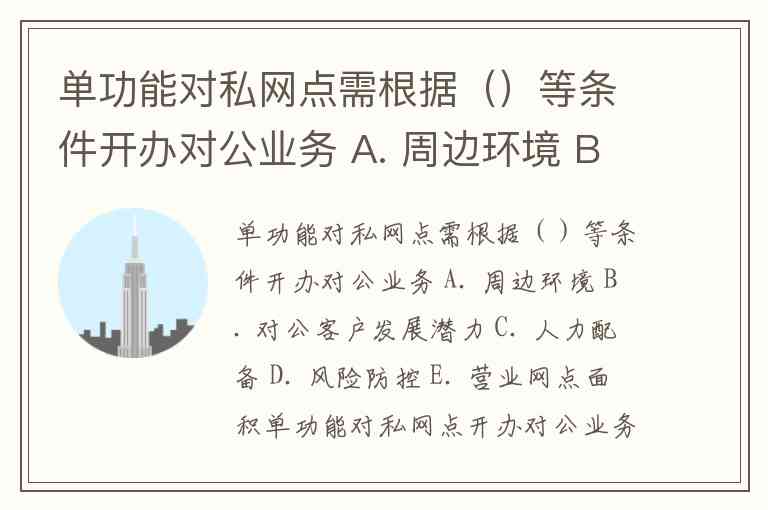 单功能对私网点开办对公业务需综合评估多方面条件,包括周边环境、对公客户发展潜力、人力配备、风险防控等核心要素(选项ABCD)。这些条件共同构成了网点转型的可行性基础,既需考虑外部市场机遇,也需确保内部运营能力达标。