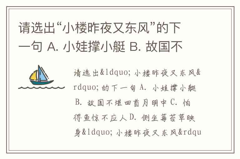 请选出“小楼昨夜又东风”的下一句 A. 小娃撑小艇 B. 故国不堪回首月明中 C. 怕得鱼惊不应人 D. 侧坐莓苔草映身