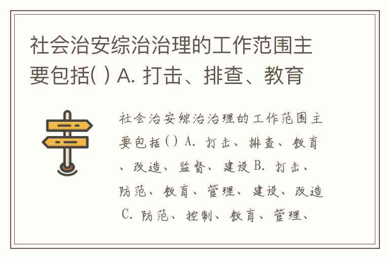 社会治安综治治理的工作范围主要包括( ) A. 打击、排查、教育、改造、监督、建设 B. 打击、防范、教育、管理、建设、改造 C. 防范、控制、教育、管理、建设、改造 D. 打击、防范、教育、控制、管理、改造