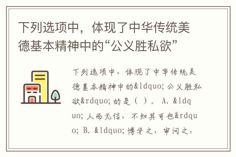 下列选项中,体现了中华传统美德基本精神中的“公义胜私欲”的是( )。 A. “人而无信,不知其可也” B. “博学之,审问之,慎思之,明辨之,笃行之” C. “凡人之所以为人者,礼义也” D. “苟利国家生死以,岂因祸福避趋之”