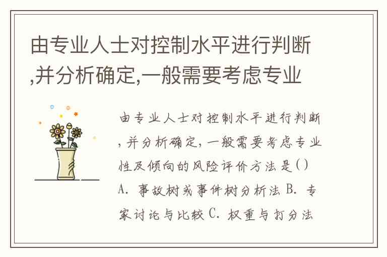 由专业人士对控制水平进行判断,并分析确定,一般需要考虑专业性及倾向的风险评价方法是( ) A. 事故树或事件树分析法 B. 专家讨论与比较 C. 权重与打分法 D. 民意测验法