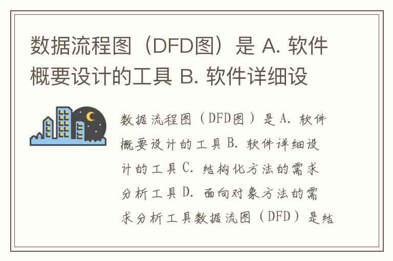 数据流程图(DFD图)是 A. 软件概要设计的工具 B. 软件详细设计的工具 C. 结构化方法的需求分析工具 D. 面向对象方法的需求分析工具