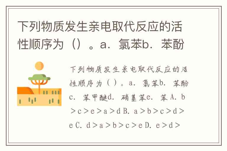 下列物质发生亲电取代反应的活性顺序为()。a.氯苯b.苯酚c.苯甲醚d.硝基苯e.苯 A. b>c>e>a>d B. a>b>c>d>e C. d>a>b>c>e D. e>d>c>b>a