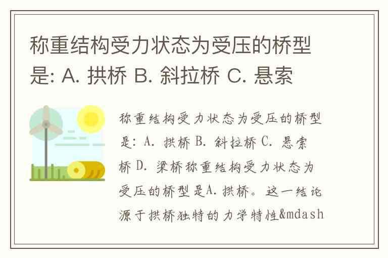 称重结构受力状态为受压的桥型是A.拱桥。这一结论源于拱桥独特的力学特性——其承重结构(如拱圈或拱肋)在竖向荷载作用下主要承受轴向压力,而非弯曲或拉力。