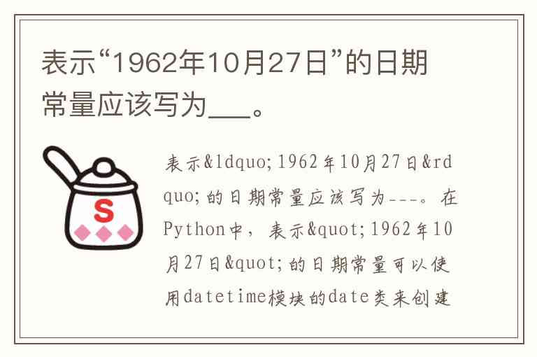 在Python中,表示"1962年10月27日"的日期常量可以使用datetime模块的date类来创建。通过指定年、月、日三个参数,我们可以得到一个不可变的日期对象,便于后续的日期计算和格式化操作。