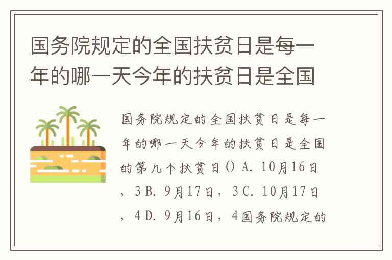 国务院规定的全国扶贫日是每一年的哪一天今年的扶贫日是全国的第几个扶贫日() A. 10月16日,3 B. 9月17日,3 C. 10月17日,4 D. 9月16日,4