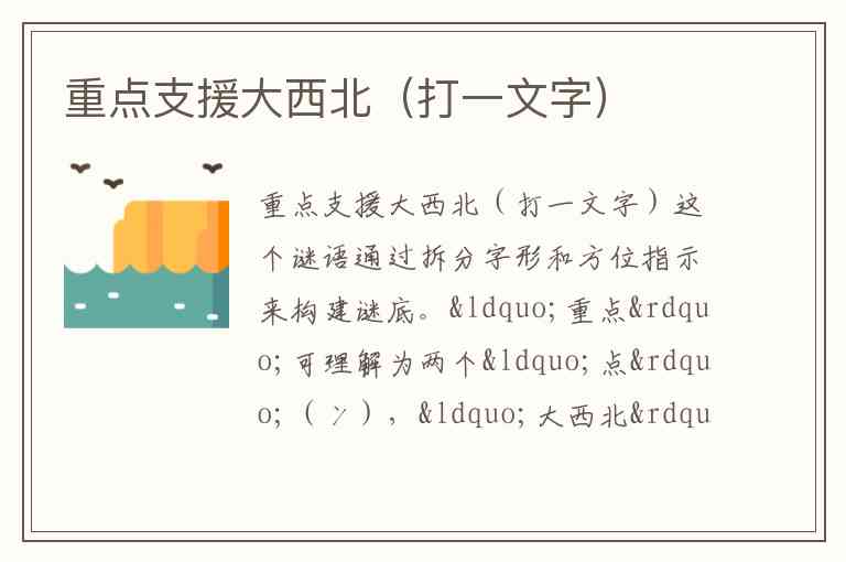 这个谜语通过拆分字形和方位指示来构建谜底。“重点”可理解为两个“点”(冫),“大西北”指向“大”字的左上角(按“上北下南左西右东”的方位,“大”字左上角为需添加部分)。将两点(冫)置于“大”字左上角,组合后便是“头”字。