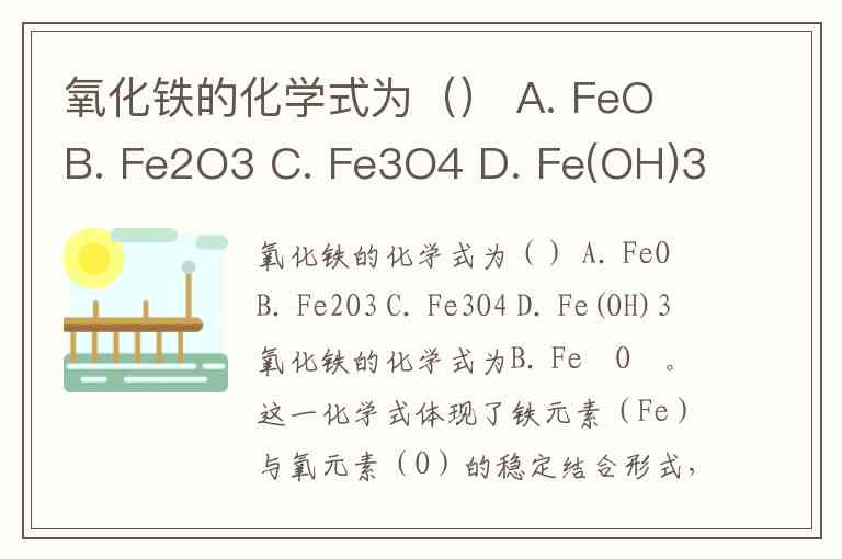 氧化铁的化学式为B. Fe₂O₃。这一化学式体现了铁元素(Fe)与氧元素(O)的稳定结合形式,其中铁显+3价,氧显-2价,通过2:3的原子比例实现电荷平衡。