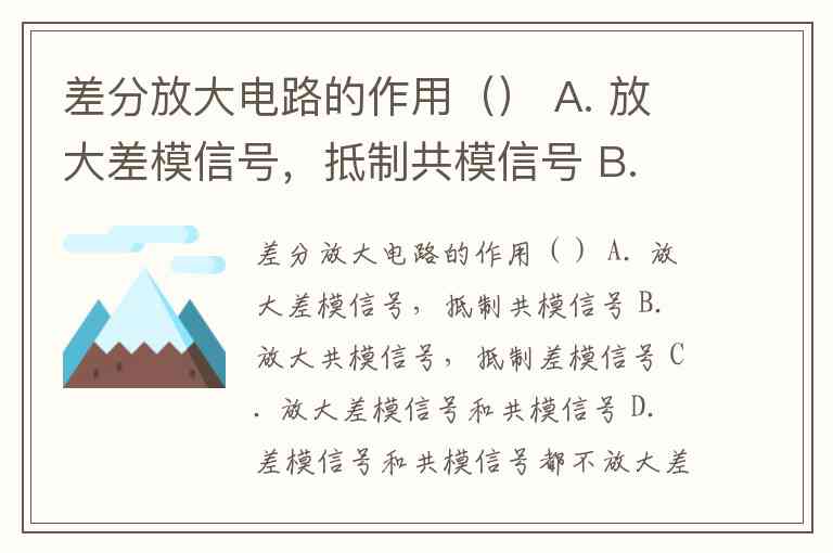 差分放大电路的作用() A. 放大差模信号,抵制共模信号 B. 放大共模信号,抵制差模信号 C. 放大差模信号和共模信号 D. 差模信号和共模信号都不放大
