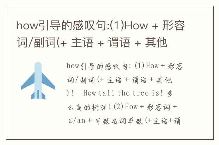 how引导的感叹句:(1)How + 形容词/副词(+ 主语 + 谓语 + 其他)!►How tall the tree is! 多么高的树呀!(2)How + 形容词 + a/an + 可数名词单数(+主语+谓语)!►How beautiful a flower! 多美的一朵花呀![拓展]what引导的感叹句通常可与how引导的感叹句进行转换。►What a lovely girl she is! = How lovely a girl she is! 她是多么可爱的一个女孩啊![典例]Guan Dong saved an old lady out of the Yangtze River. _____ great courage he showed! A. What a B. What C. How a D. How