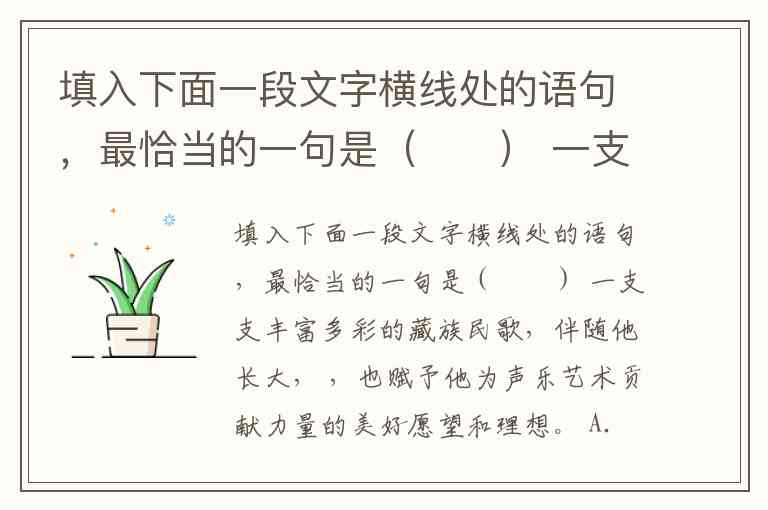 填入下面一段文字横线处的语句,最恰当的一句是( ) 一支支丰富多彩的藏族民歌,伴随他长大, ,也赋予他为声乐艺术贡献力量的美好愿望和理想。 A. 使他练就一副清脆豪放的好嗓音 B. 他的嗓音被练得清脆豪放 C. 他被练就一副清脆豪放的好嗓音 D. 练就他的清脆豪放的好嗓音
