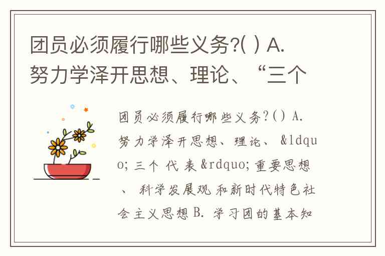 团员必须履行哪些义务?( ) A. 努力学泽开思想、理论、 “三个 代 表 ”重要思想 、 科学发展观 和新时代特色社会主义思想 B. 学习团的基本知识,学习科学、文化、法律和业务知识 C. 努力学习马克思列宁主义 D. 不断提高为人民服务的本领