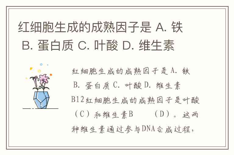 红细胞生成的成熟因子是 A. 铁 B. 蛋白质 C. 叶酸 D. 维生素B12