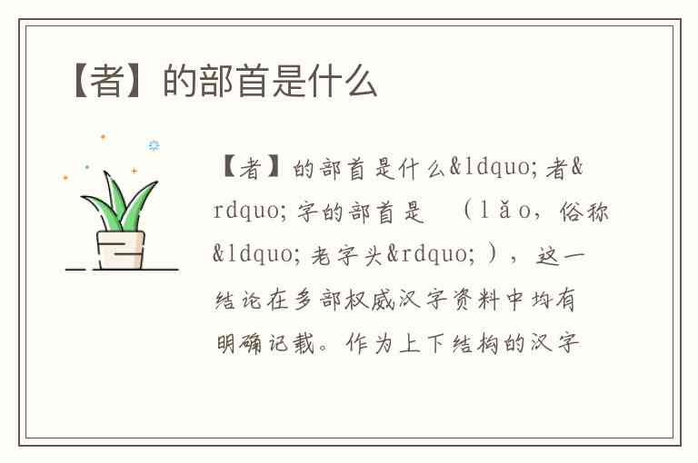 “者”字的部首是耂(lǎo,俗称“老字头”),这一结论在多部权威汉字资料中均有明确记载。作为上下结构的汉字,“者”由上部的“耂”和下部的“日”组成,总笔画为8画,其中部首“耂”占4画,部外笔画同样为4画。