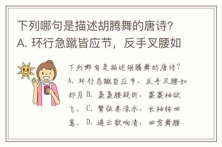 描述胡腾舞的唐诗是A选项“环行急蹴皆应节,反手叉腰如却月”,出自唐代诗人李端的《胡腾儿》。这句诗精准捕捉了胡腾舞的核心特征:“环行急蹴”描绘舞者绕圈疾走、脚步急促踢踏的动态,“皆应节”点明动作与音乐节奏的完美配合;“反手叉腰如却月”则以“却月”(弯月)比喻舞者反手叉腰时的造型,既展现身体的柔韧弧度,又暗含舞蹈的视觉美感。