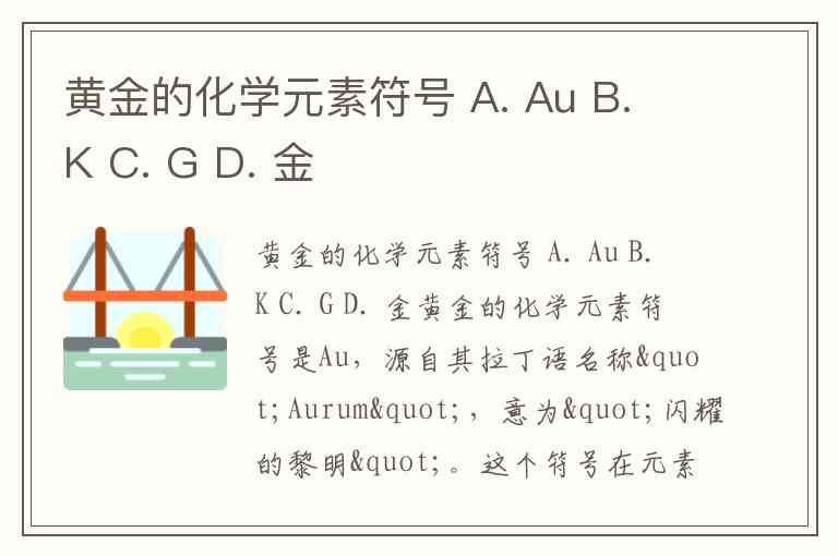 黄金的化学元素符号 A. Au B. K C. G D. 金