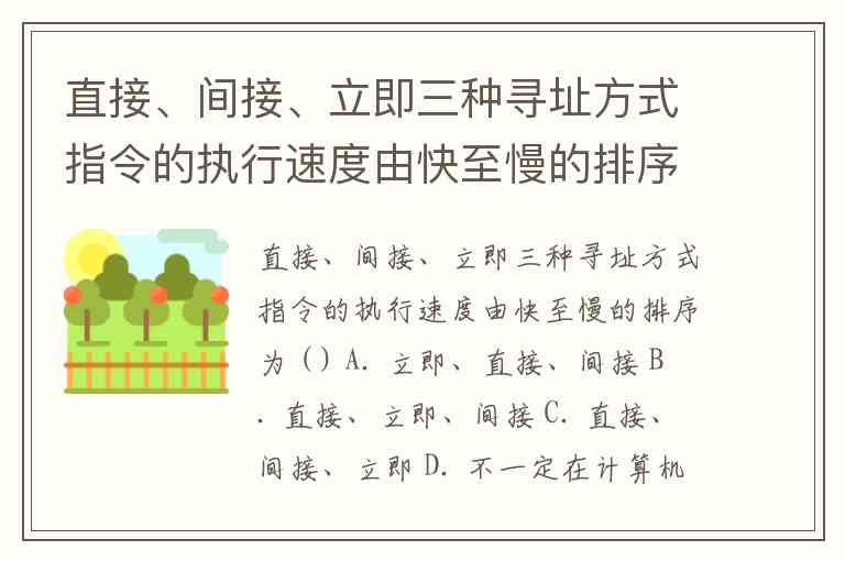 直接、间接、立即三种寻址方式指令的执行速度由快至慢的排序为 ( ) A. 立即、直接、间接 B. 直接、立即、间接 C. 直接、间接、立即 D. 不一定