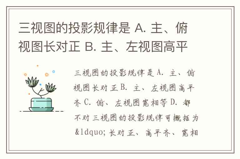 三视图的投影规律是 A. 主、俯视图长对正 B. 主、左视图高平齐 C. 俯、左视图宽相等 D. 都不对