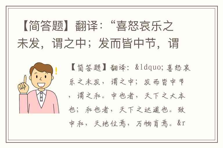 【简答题】翻译:“喜怒哀乐之未发,谓之中;发而皆中节,谓之和。中也者,天下之大本也;和也者,天下之达道也。致中和,天地位焉,万物育焉。”