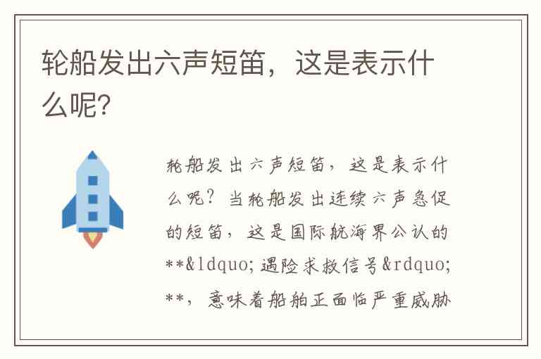 当轮船发出连续六声急促的短笛,这是国际航海界公认的**“遇险求救信号”**,意味着船舶正面临严重威胁,需要紧急援助。这种信号通常在三种危急情况下使用:一是遭遇极端天气如狂风巨浪、海啸等,船舶操控能力严重受损;二是发生重大故障,如火灾、漏水、引擎停机等导致船舶失控;三是受到外部威胁,如碰撞风险或恐怖袭击等紧急状况。