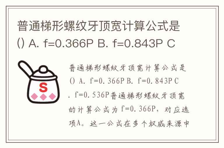 普通梯形螺纹牙顶宽的计算公式为 f=0.366P,对应选项A。这一公式在多个权威来源中被明确提及,适用于牙形角为30°的标准梯形螺纹,其中P代表螺距。