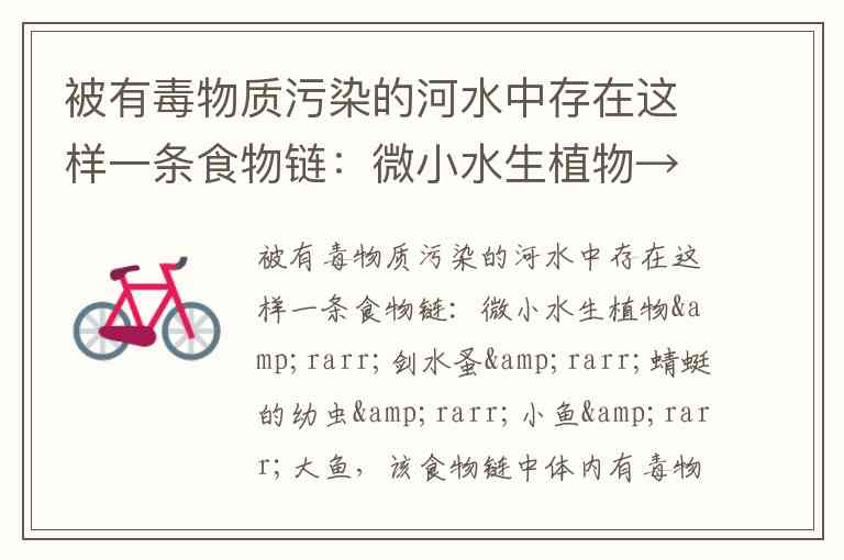 在食物链中,有毒物质会通过生物放大现象逐级浓缩,即营养级越高的生物体内积累的毒素浓度越高。以题目中的食物链“微小水生植物→剑水蚤→蜻蜓的幼虫→小鱼→大鱼”为例,大鱼作为最高营养级的消费者,其体内有毒物质积累量最多。