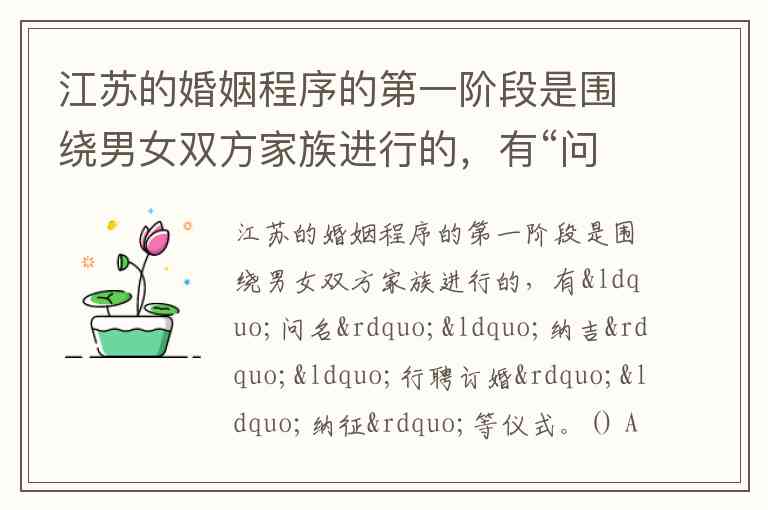 江苏的婚姻程序的第一阶段是围绕男女双方家族进行的,有“问名”“纳吉”“行聘订婚”“纳征”等仪式。() A. 正确 B. 错误