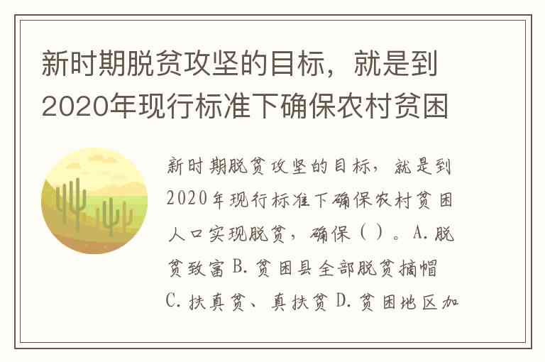 新时期脱贫攻坚的目标,就是到2020年现行标准下确保农村贫困人口实现脱贫,确保()。A.脱贫致富 B.贫困县全部脱贫摘帽 C.扶真贫、真扶贫 D.贫困地区加快发展