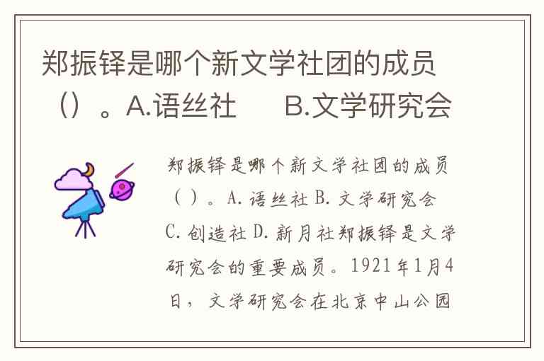郑振铎是哪个新文学社团的成员()。A.语丝社 B.文学研究会 C.创造社 D.新月社