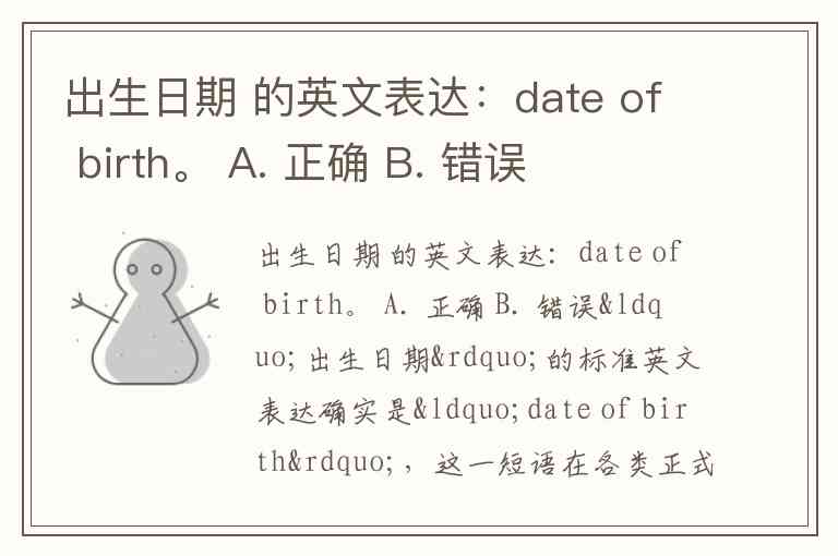 出生日期 的英文表达:date of birth。 A. 正确 B. 错误