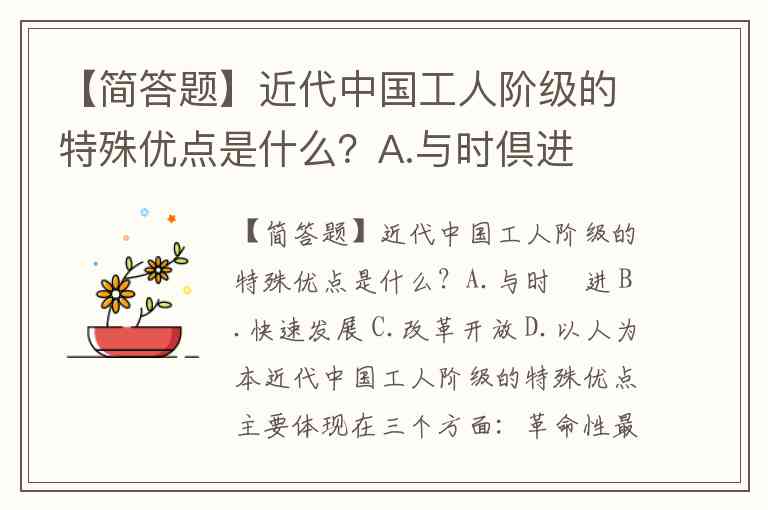 【简答题】近代中国工人阶级的特殊优点是什么?A.与时倶进 B.快速发展 C.改革开放 D.以人为本