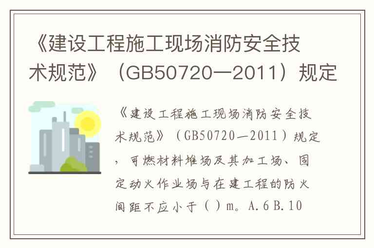 《建设工程施工现场消防安全技术规范》(GB50720-2011)明确规定,可燃材料堆场及其加工场、固定动火作业场与在建工程的防火间距不应小于10m。这一要求针对火灾危险性较高的区域,旨在通过物理距离阻隔火势蔓延,降低施工现场火灾风险。