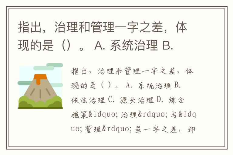 指出,治理和管理一字之差,体现的是()。 A. 系统治理 B. 依法治理 C. 源头治理 D. 综合施策