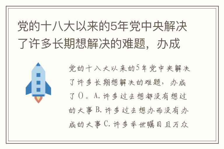 党的十八大以来的5年党中央解决了许多长期想解决的难题,办成了()。A.许多过去想都没有想过的大事 B.许多过去想办而没有办成的大事 C.许多举世瞩目且万众称颂的大事 D.许多继往开来并影响深远的大事